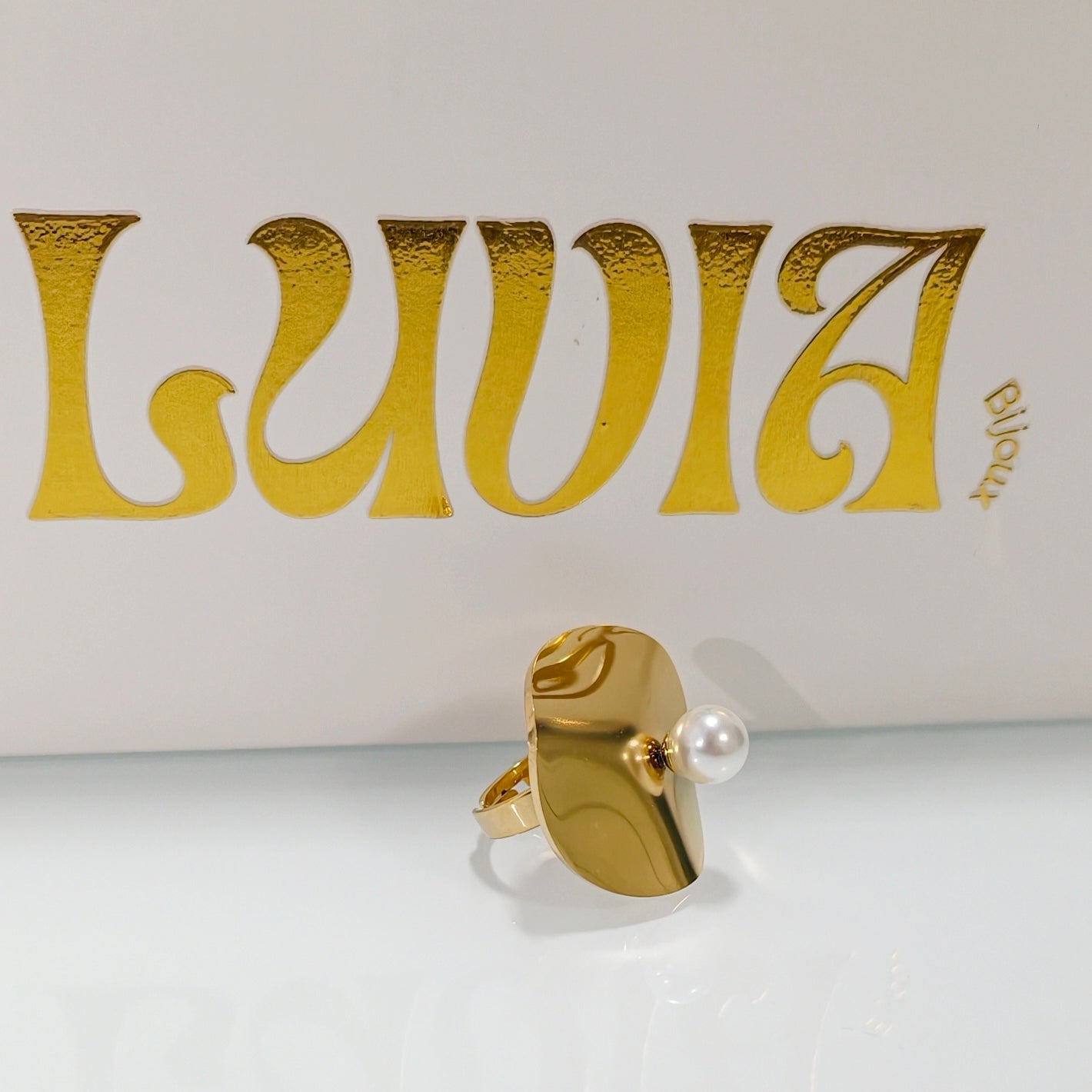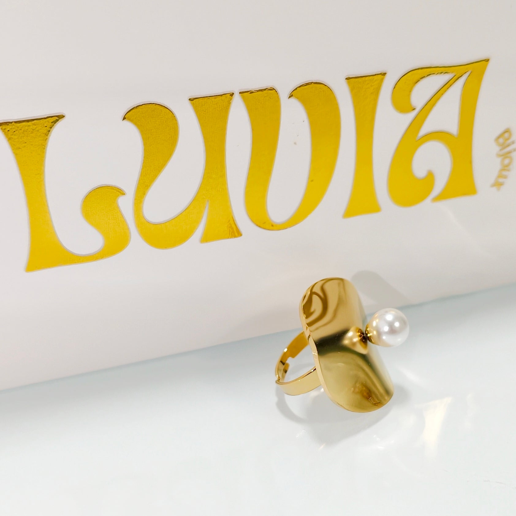 Bague réglable de forme cylindrique et irrégulière avec sa perle blanche.