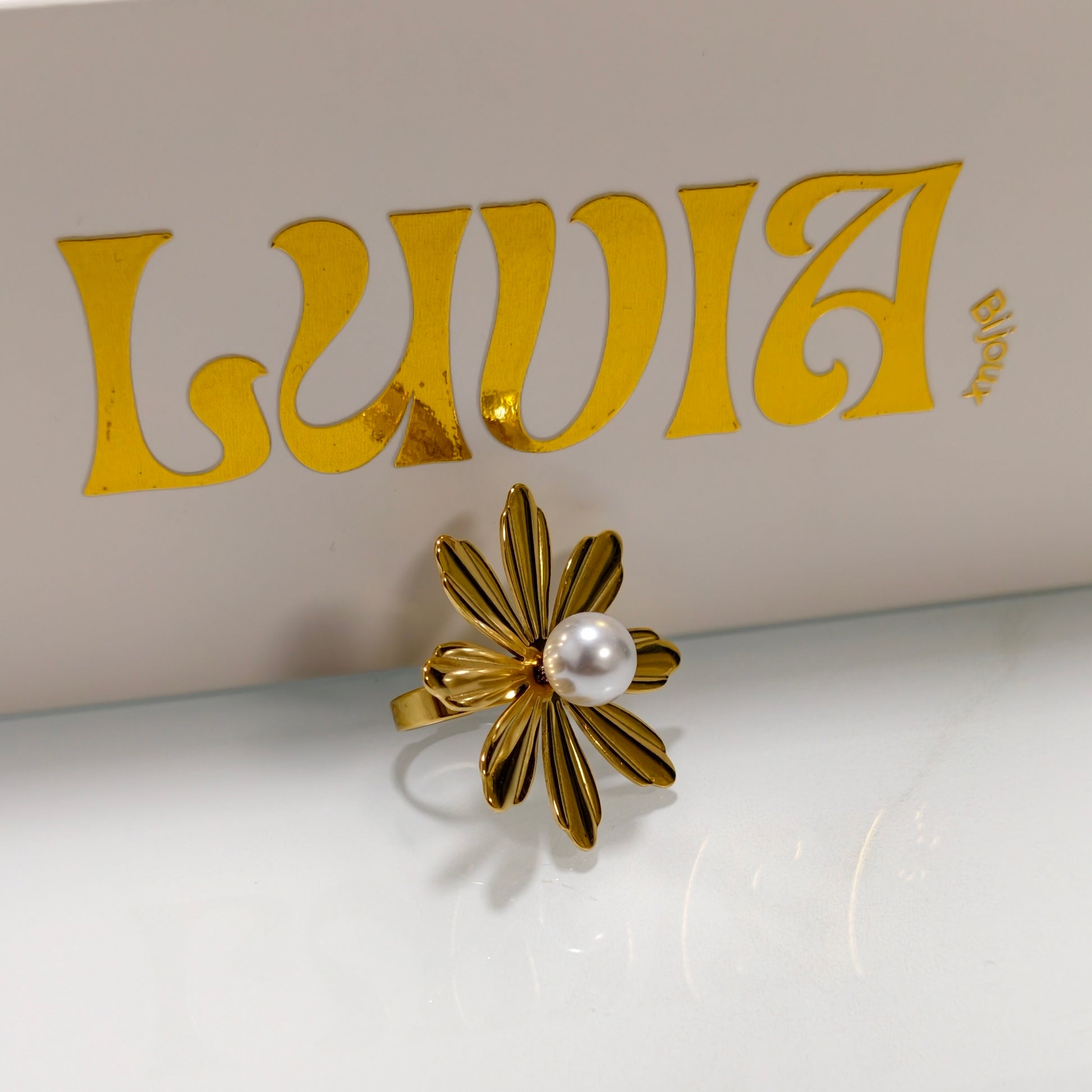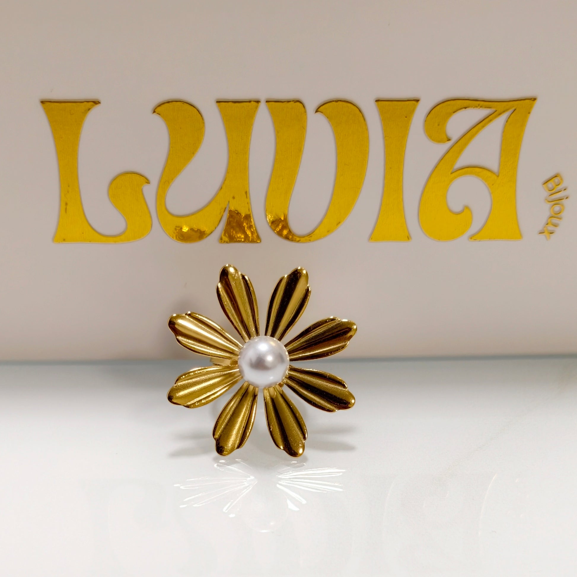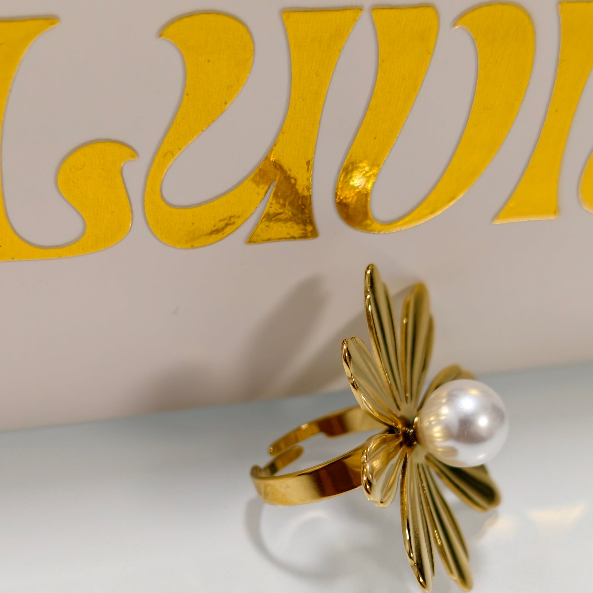 Bague réglable en forme de fleur avec sa perle blanche en acier inoxydable.
