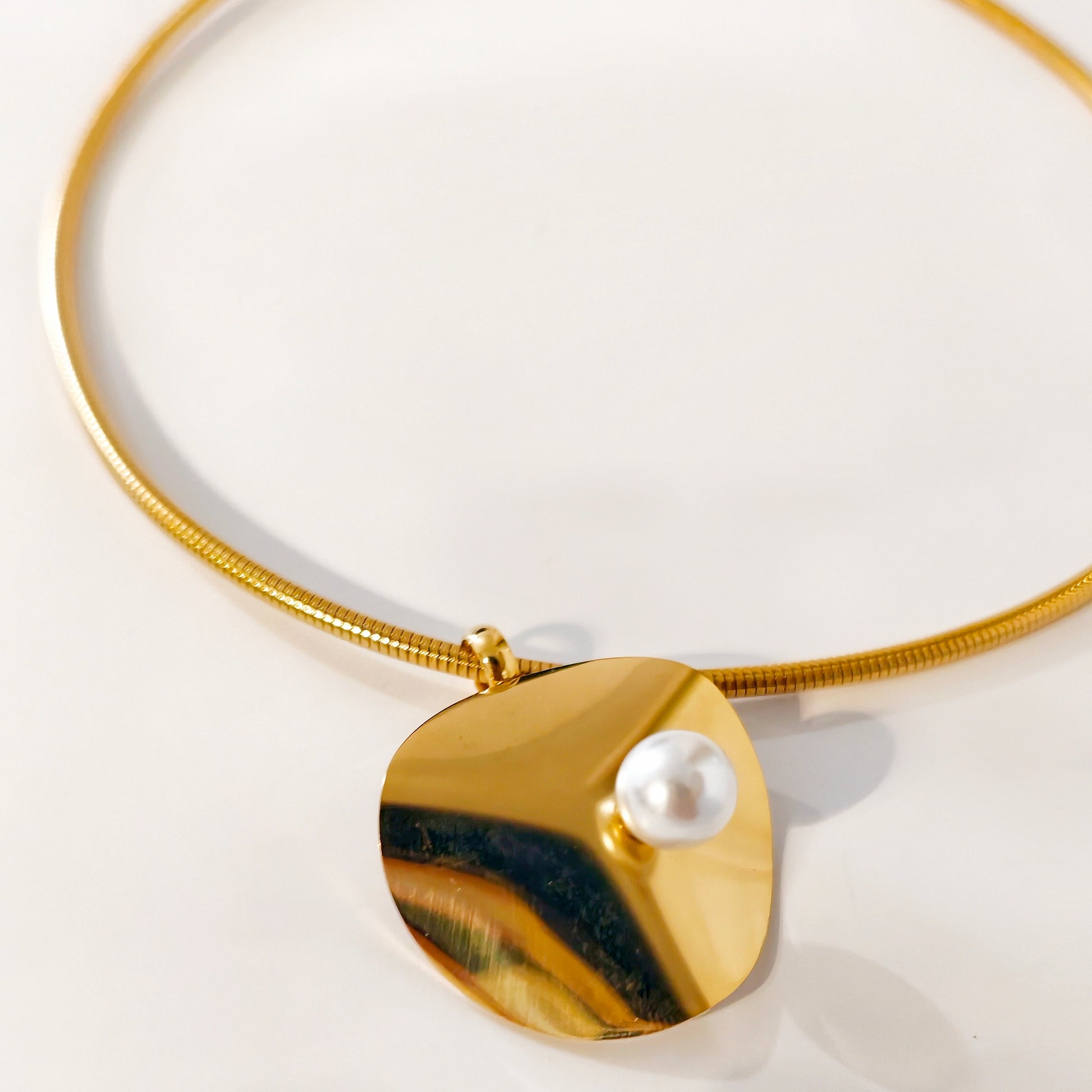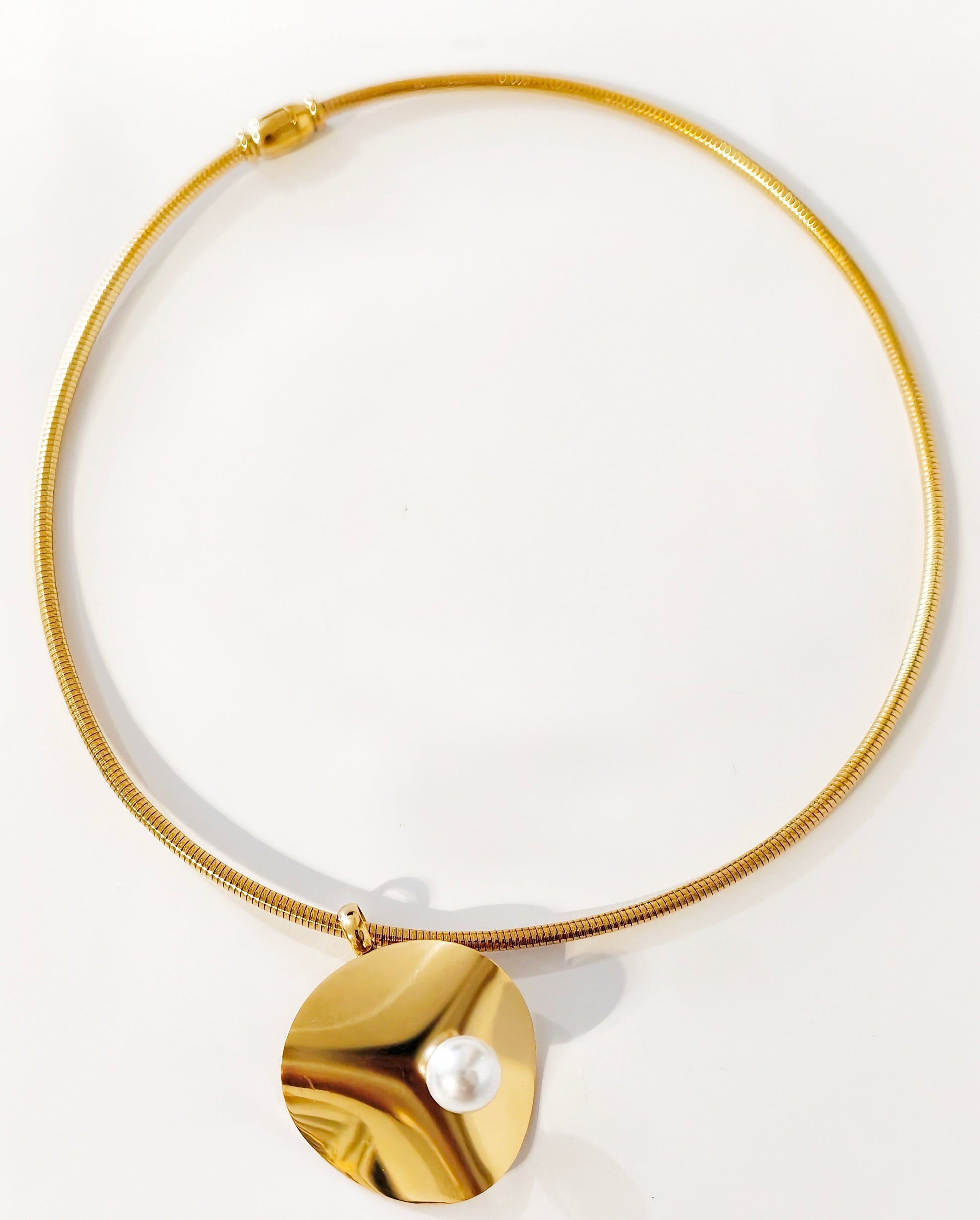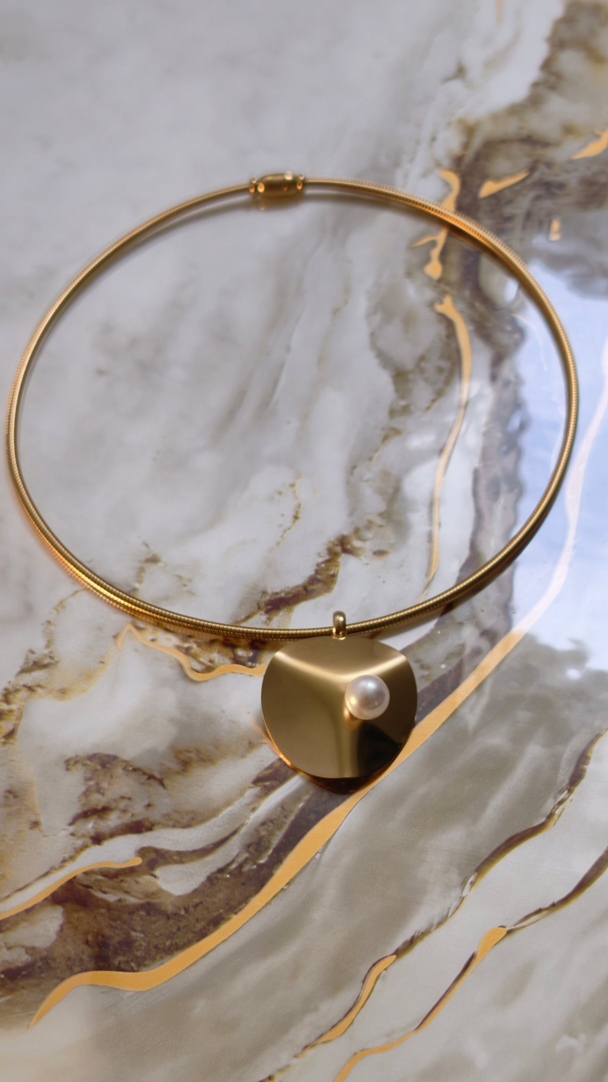 Collier type ras de cou en acier inoxydable avec sa perle blanche.